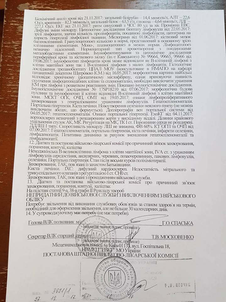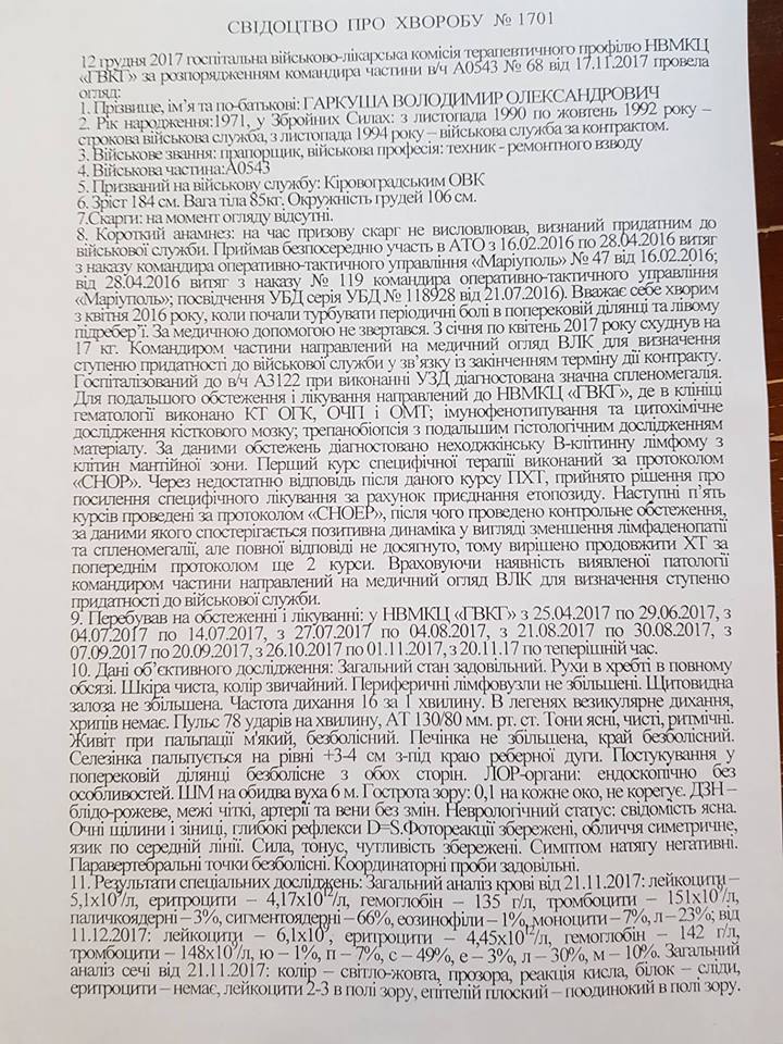 In April 2017 he started to have a pain in his kidneys and took a medical advice. Doctors gave him a diagnosis of breast bone and abdominal cavity lymphoma, mainly in groin and spleen – the 4th stage of disease. At the moment he undergoes a course of medical treatment at the Main Military Medical Clinical Centre and needs costly treatment by foreign medicines. Each course of such treatment costs 23 thousand UAH which Volodymyr’s family cannot afford.
