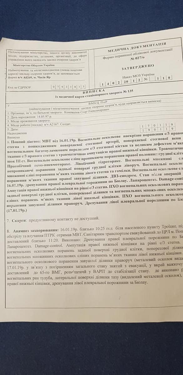 На данний час (березень 2019) проходить лікування в Київському шпиталі та готується до протезування.